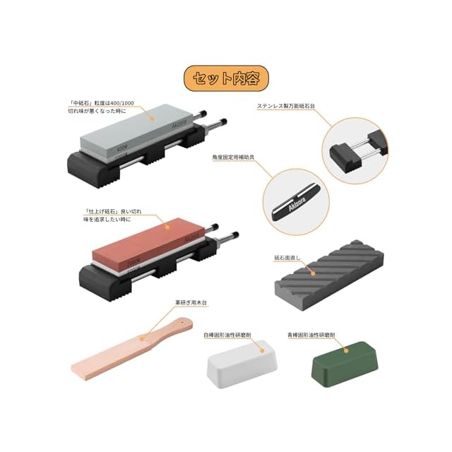 Akizora 砥石 包丁研ぎ石 400 1000 2000 6000 両面砥石 万能砥石台付き 面直し 角度固定ホルダー付き 革砥付き 白棒 青棒 家庭用荒砥石 中砥石 包丁研ぎに最適 | つむぎ屋