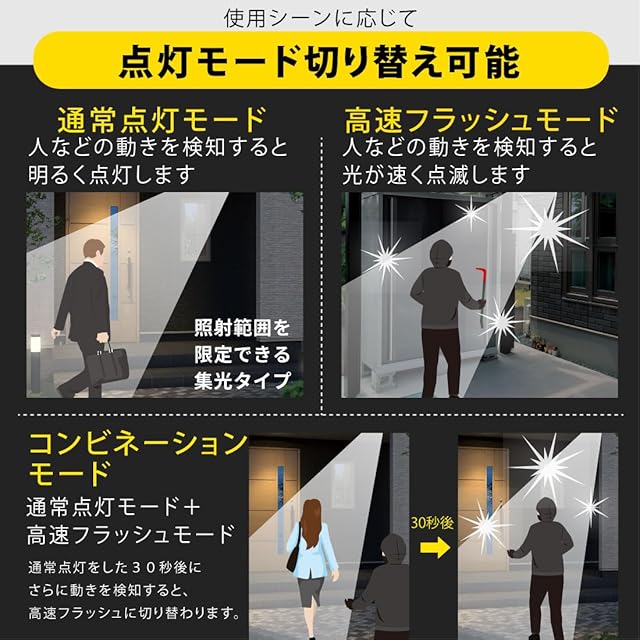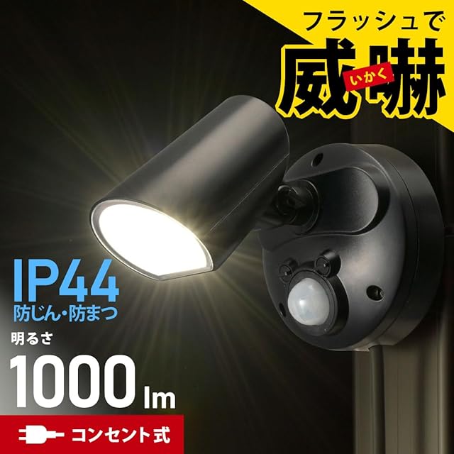【 特 長 】 ◆強力な明るさ、1000ルーメン ◆高速フラッシュ点滅で不審者に警告、不審者の存在を周囲に知らせます ◆使用シーンに応じて点灯モード切り替えができます・ 通常点灯モード…人などの動きを感知すると明るく点灯します(点灯時間は約5秒/2分/5分調節可能)・ 高速フラッシュモード…人などの動きを検知すると光が速く点滅します・ コンビネーションモード(通常点灯モード+高速フラッシュモード)…通常点灯をした30秒後にさらに動きを検知すると、高速フラッシュに切り替わります ◆検知範囲は最大約120°、最長約7m ◆光源色は昼光色 ◆保護等級はIP44の防じん防まつ形 ◆取り付け方法はネジ止め、クランプ止め、ステンレスバンド止めの3通り ◆コンセント式
