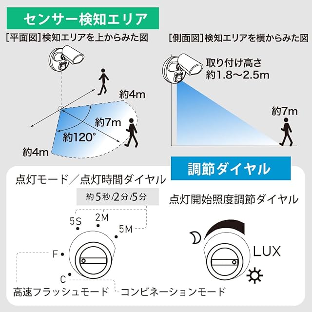 【 特 長 】 ◆強力な明るさ、2000ルーメン ◆高速フラッシュ点滅で不審者に警告、不審者の存在を周囲に知らせます ◆使用シーンに応じて点灯モード切り替えができます・ 通常点灯モード…人などの動きを感知すると明るく点灯します(点灯時間は約5秒/2分/5分調節可能)・ 高速フラッシュモード…人などの動きを検知すると光が速く点滅します・ コンビネーションモード(通常点灯モード+高速フラッシュモード)…通常点灯をした30秒後にさらに動きを検知すると、高速フラッシュに切り替わります ◆検知範囲は最大約120°、最長約7m ◆光源色は昼光色 ◆保護等級はIP44の防じん防まつ形 ◆取り付け方法はネジ止め、クランプ止め、ステンレスバンド止めの3通り ◆コンセント式