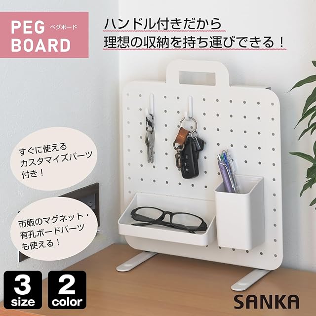 サンカ ペグボード 持ち運びできるスチール製有孔ボード 卓上収納 マットホワイト 小 マグネット対応 フック・ポケット付属ですぐに使える 持ち手付き フックがずれない 見せる収納 標準ピッチ幅 25mmなので市販のパーツも使用可能 有孔ボード 背面も使える 壁掛け可能 (幅30×高さ36cm) 白 デスク 机 文具 キッチン コスメ おしゃれ SANKA PEG-3030WH | つむぎ屋