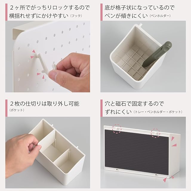 フック×2、トレー×1、ポケット×2が付属。市販のマグネット用、有孔ボード用パーツも使用できるので、お好みの収納を作っていただけます。