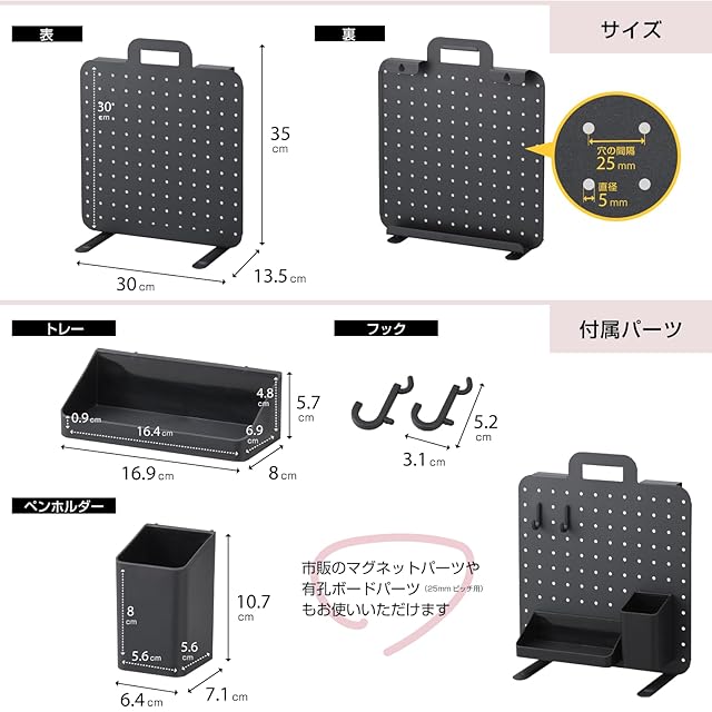 フック×2、トレー×1、ポケット×1が付属。市販のマグネット用、有孔ボード用パーツも使用できるので、お好みの収納を作っていただけます。