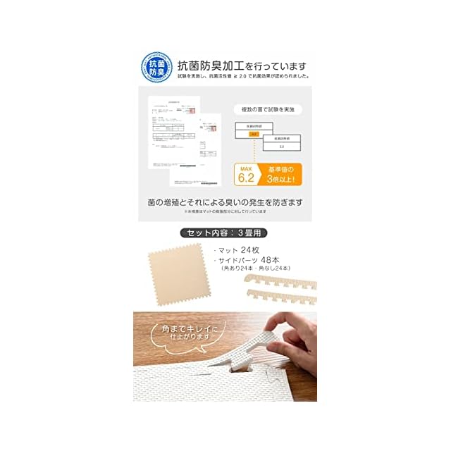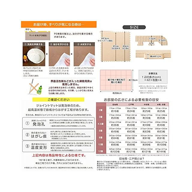 ・床暖房の種類等によって、商品に多少の反りが生じる場合がございます。 ・重量物を載せますと、マットが凹み変形する恐れがあります。 ・PE素材の特性上、使用するうちに負荷がかかる部分に多少のへたりが生じる場合がございます。 そのため、既に使用しているマットに新しいマットを繋げて使用する際、上手く繋がらない場合もございます。 ・床材(塩化ビニル・フローリング等)によって、色移りや変色が起こる場合がございます。床とマットの間に敷物や防護シートを敷いていただくことを推奨しております。 ※類似品が出回っております。本製品はシリーズ累計110万セットを突破。ホルムアルデヒドの検査や耐熱検査をし、品質にこだわった商品です。品質や販売実績は真似できません。商標登録済み ※2019年1月10日に素材をEVAからPEに変更しました。