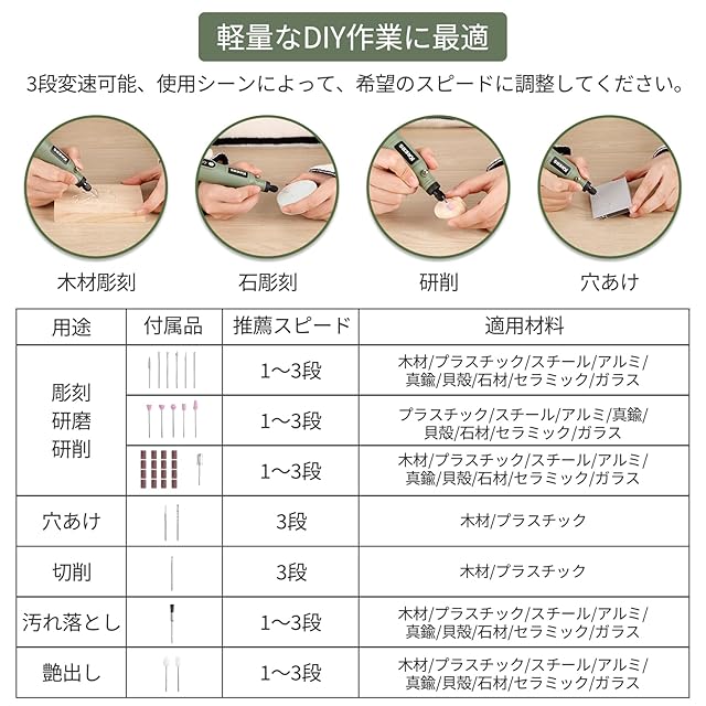 【5段階調速】ミニルーターは、5000から18000rpmまで5段階の変速ができ、作業内容や材料に合わせてもっと便利に適切な回転数を選択できます。
