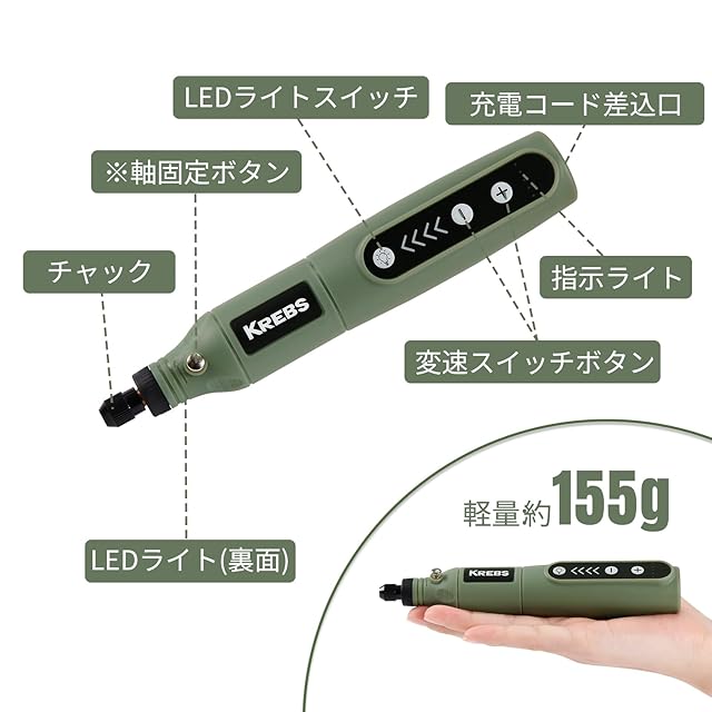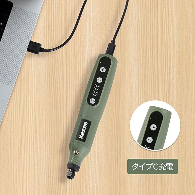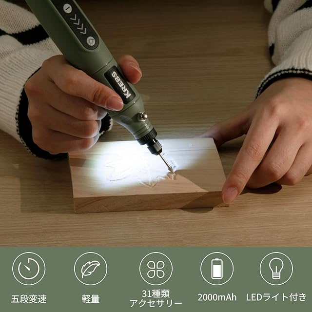 KREBS(クレブス) 充電ミニルーター(リューター)3.6V 電動ルーター 軽量 5段変速 最高18000rpm高速回転 ビット31点セット 照明ライト TYPE-C 充電式 コードレス 彫刻/研磨/切削/穴あけ/汚れ落とし/つや出し DIY軽作業向け | つむぎ屋