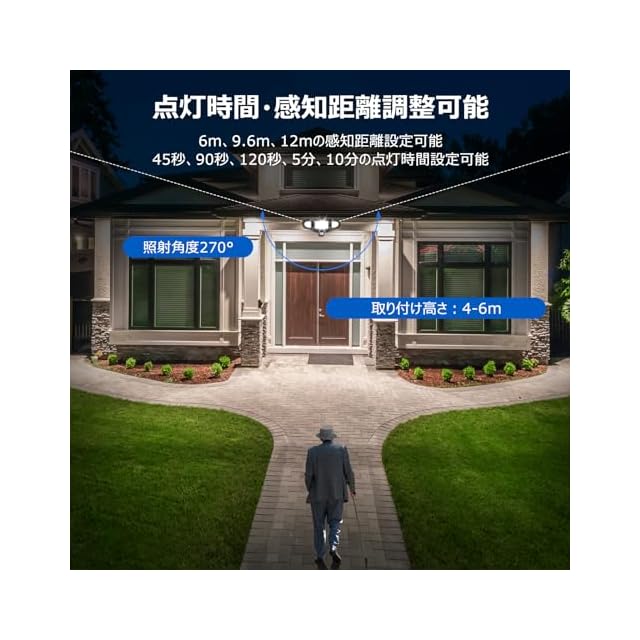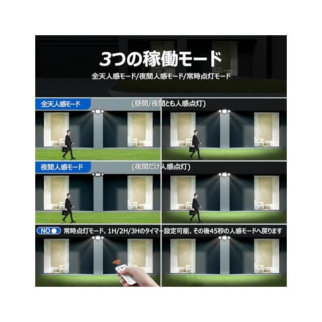 ★【便利なリモコン操作---点灯時間・検知距離・稼働モード・明るさ調整可能】この高輝度防犯ライトはリモコン付きで操作は自由です。高い所に設置する場合、リモコンで明るさやモードを切り替えができることが便利です。リモコンの最大のコントロール距離は:12m。✦稼働モード設定:☀昼間モードは全天24時間に人や動物が近づくと自動的に点灯します。☪夜間モードは夜だけ点灯します。✦点灯時間設定:ライトの連続点灯時間は45秒、90秒、120秒、5分、10分を自由に設定することができます。✦検知距離調整:センサー部の探知範囲水平最大約180度・約12m(目安として高さ約4m-6m設置)。また、センサー部の検知距離は6m、9.6m、12mを設定可能です。✦明るさ調整可能:無段階調光可能です。使用シーンに合わせて、明るさを細かくて調整できてとっても便利で省エネにもなります。【特徴】◆明るさ:強力4200ルーメン ◆常時点灯/常時消灯機能&1H/2H/3Hのタイマー設定可能 ◆無段階調光可能 ◆家庭用100V電源タイプ ◆両側のライトが動き可能、お好みの位置を照らすことができます