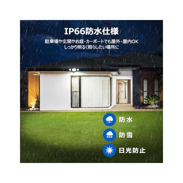 ★【IP66防水仕様&取り付け簡単】IP66防水防塵仕様で設置場所は室内と屋外でも適用です。設置場所を選ばず、様々な場所で活躍します。(完全防水ではありません。本製品が常に濡れている状態の設置方法は故障の原因となりますので、降雨時以外は風通しのよい環境への設置をおすすめします)。センサーライトは、ネジで壁に固定だけで安装完了。複雑な配線工事不要ですので、女性でも気軽に安装することができます。設置場所:室内・屋外でも適用です。ご家庭の玄関・門扉・物置・ガレージなどや事務所・店舗・倉庫・工場などの出入り口での防犯や明かり取りに最適です。