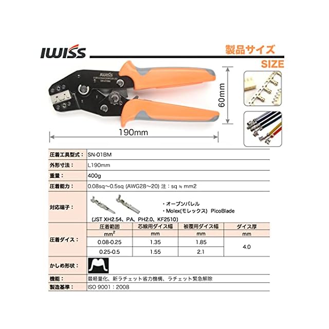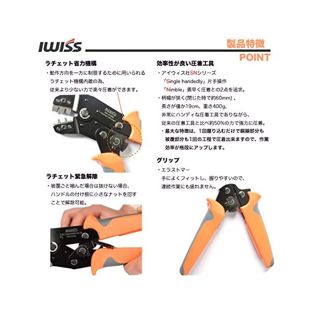 特徴:①新ラチェット機能装備、片手でも素早い締め付けが可能。②EDM加工によりダイスの弾性係数、硬度が高い。③芯線部・被覆部同時圧着可能。