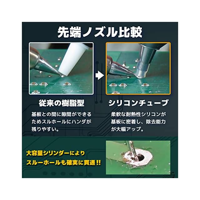 大容量シリンダーとシリコンノズルで、吸引力に優れたハンダ吸取器。