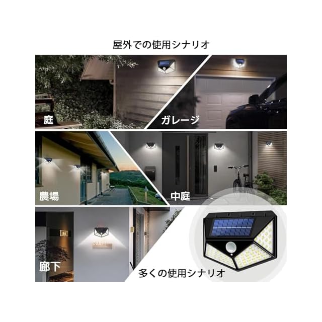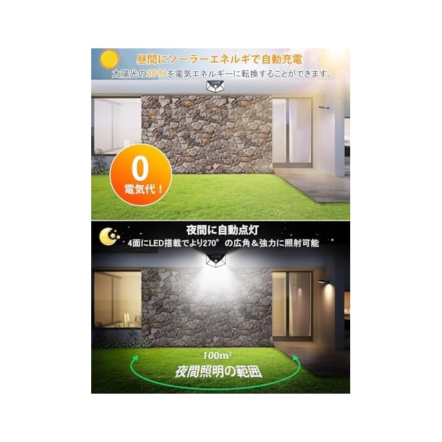 【2025最新版が登場・高輝度・4面発光】ソーラーライト2024の最新進化版が発売されました!アップグレードされた高輝度LEDチップは4面を同時に照らし、照射範囲は270°、3つのスマートセンサーモードを搭載。 熱の発生が少なく、赤外線や紫外線が少ないので虫が集まりにくい。センサーの検知角度が120°になったので、ほとんどの角度から不審者を威嚇できます。 光が柔らかく、夜間の照度が高いだけでなく、居心地の良い雰囲気を演出します。玄関、庭、廊下、店舗、ガレージ、庭、バルコニー、駐車場などの防犯・照明に最適。