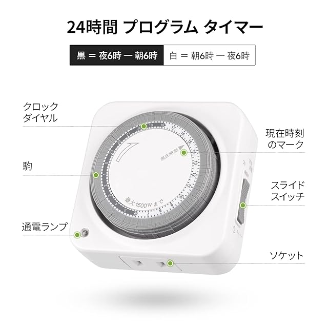 【見やすい外観&一目でわかる】外観でシンプルなフォルムですが、角が丸いので優しい印象に与えられます。ダイヤルに昼と夜の時間が白と黒で区切られています。(朝6時~夜6時は白、夜6時∼翌日の朝6時は黒)、もっとはっきり見えます。そして、「電源確認ランプ」が付きのため、通電しているかどうか一目で確認できます。設定も操作も簡単し、年配の方でもおすすめします!