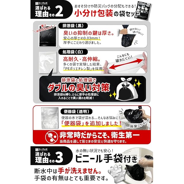 【ポリ袋セットへのこだわり】POINT①便器袋:非常時だからこそ、衛生第一。処理が格段に楽になります。 POINT②排泄袋:耐久性と伸縮性が推し。様々な実験から「PEポリエチレン製」を採用。 POINT③処理袋:厚さ0.03mm(一般的には0.01mmを使用)の肉厚仕様で防臭強化。