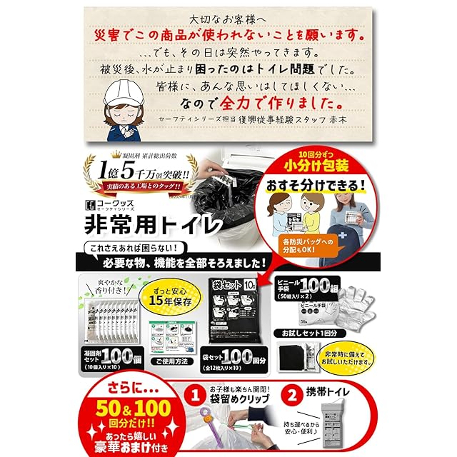 【2024年11月新登場 その日は突然やってきます 早めの備えを】 Co-Coodsスタッフの赤木と申します。私は2011年の大きな災害の際、5年間にわたって復興支援を行ってきました。災害が起きると、平穏な日々の中では想像がつきにくいかもしれませんが、高い確率で水が不足します。飲み水は最優先で対策が行われますが、「トイレ」の対策に関しては、おざなりになってしまうのが現実です。そんな時、私が開発したCo-Goodsセーフティーシリーズ「 非常用トイレ 簡易トイレ 」が必ずお役に立てます。5年間現地を見てきた私が開発しましたので自信があります!是非早めの備えをお願いいたします。