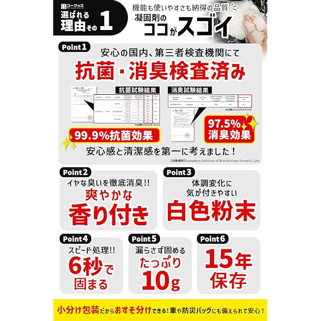 【検査機関で実証済み 高品質・こだわりの凝固剤】 POINT①99.9%抗菌効果。 POINT②97.5%消臭効果。 POINT③爽やかな香り付き。 POINT④6秒で固まる即効性。 POINT⑤たっぷり容量10g。 POINT⑥体調変化が分かりやすい白色。 POINT⑦最長15年保存。