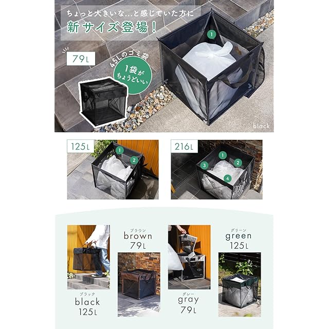 【45Lゴミ袋約袋収納可能!!】79L / 125L/ 216Lの選べる大容量ゴミステーションを簡単組立。大型な固定されたものではなく、軽量なゴミネットボックスなのでバルコニーや庭、玄関先など設置場所を選びません。メッシュデザインで臭いもこもらないので一時置きに最適です。