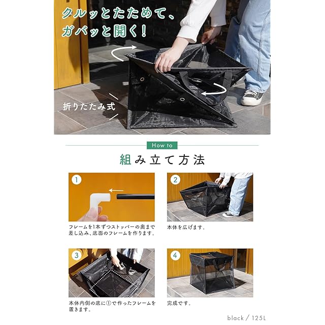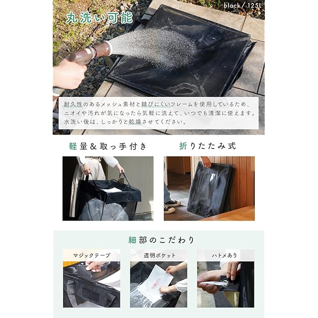 【高強度フレーム×高密度ネット】créer(クレエ) カラスよけゴミ箱 折りたたみ [ 選べる3サイズ × 4カラー ] 軽量 ゴミネット ボックス 大容量 屋外 屋内 (125L / ブラック) | つむぎ屋