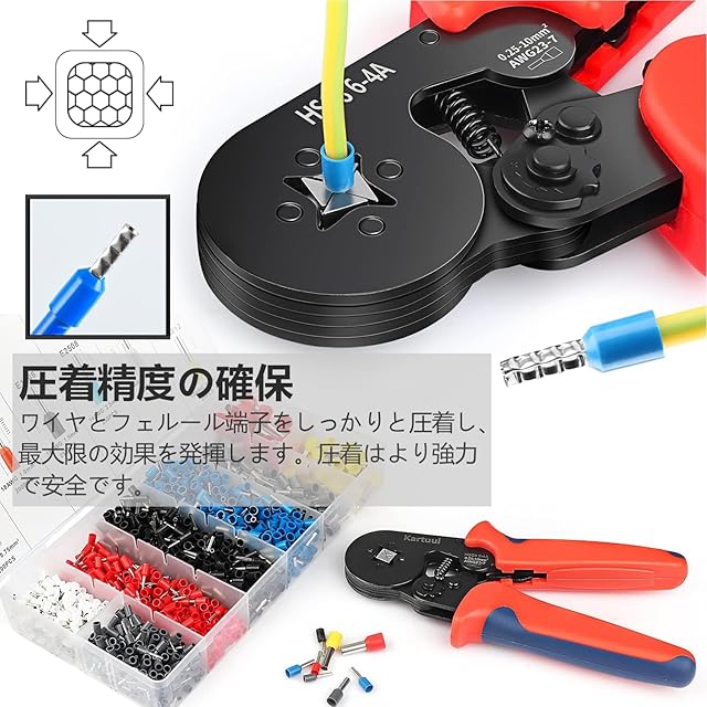 【幅広い用途】圧着ペンチは6方向から同時に圧縮でき、圧着面はほぼ円形です。電気部品の取り付けや配線に使用できます。作業場、自動車電気技師、整備士、自動車および家庭用電気のメンテナンス作業に適した圧着工具セットです。