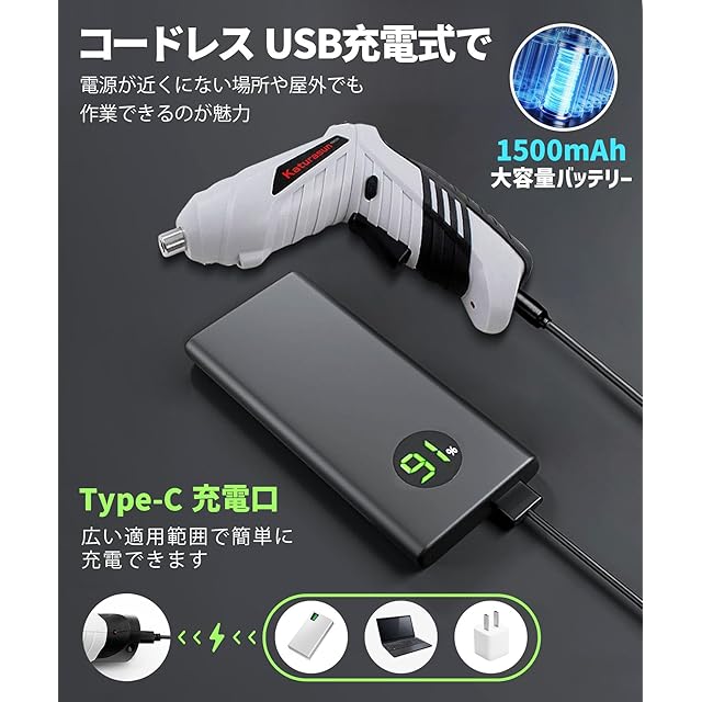 【長いバッテリー寿命】:の電動ドライバー 充電式、1500mAhの大容量バッテリーを内蔵しており、あらゆるネジ切りのニーズに対応する信頼性の高いパフォーマンスを発揮します。プロジェクトに取り組んでいる間、頻繁な充電の手間から解放されます
