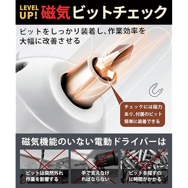 【マグネットビットホルダー】:この電気ドリルセットには、付属の10個のビットを所定の位置にしっかりと保持するマグネットチャックが付属しています。この便利な機能により、作業中にビットを紛失することがなくなり、作業効率と生産性が向上します