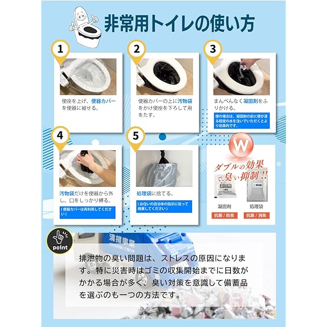 【抗菌・消臭機能】抗菌・消臭性能付きの凝固剤が便や尿を素早くゼリー状に固め、臭いや菌の発生を抑えます。