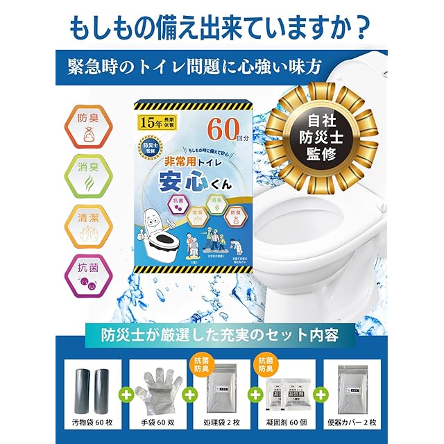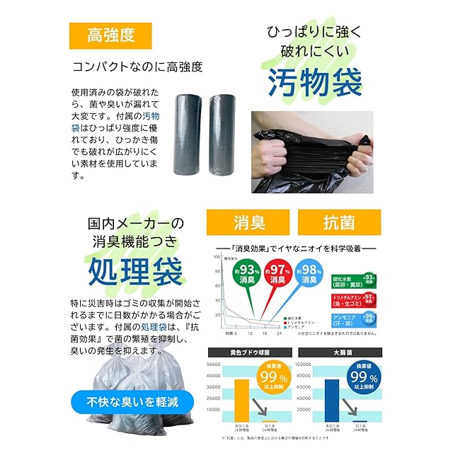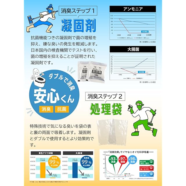 【抗菌・消臭機能】抗菌・消臭性能付きの凝固剤が便や尿を素早くゼリーに固め、臭いや菌の発生を抑えます。さらに処理袋にも抗菌・消臭機能をプラスしました。ダブルの効果で臭いを閉じ込めます。