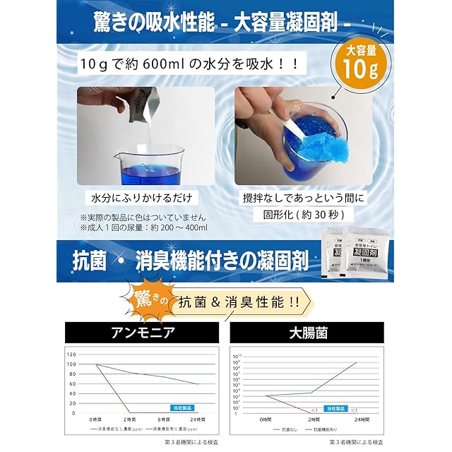 【超吸収凝固剤】10gで約600cc(成人一回の排尿量200~400mL)の吸水が可能です。
