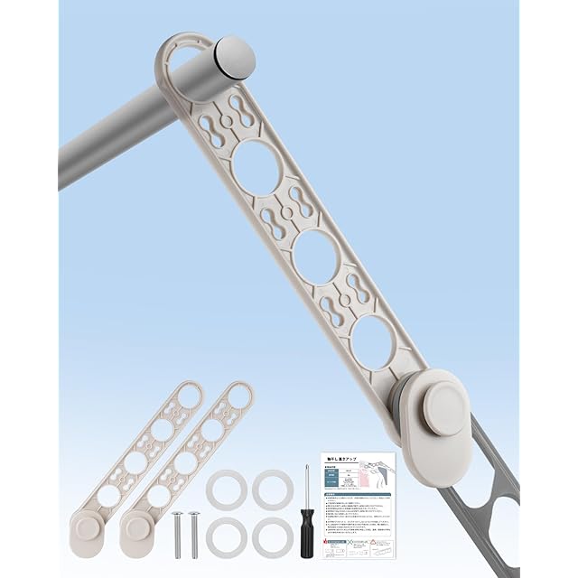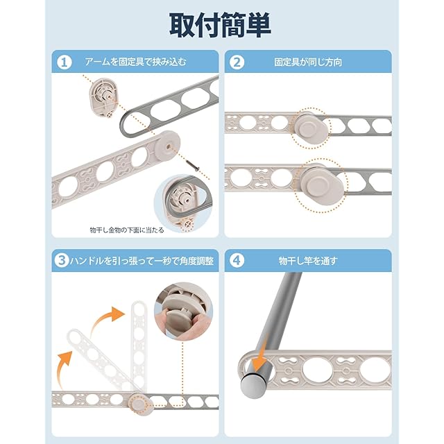 6.【取付簡単&常設可能】:簡易ドライバーと日本語取扱説明書が付属しており、ネジを回すだけで一人でも簡単に取り付ける、使用しない場合は、物干し竿を挿したままアームを折りたたみ、コンパクトに収納可能、ベランダを広く使えます。