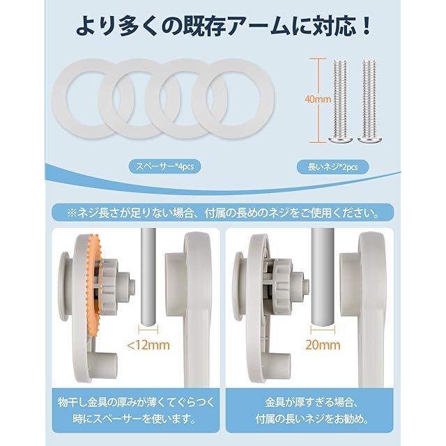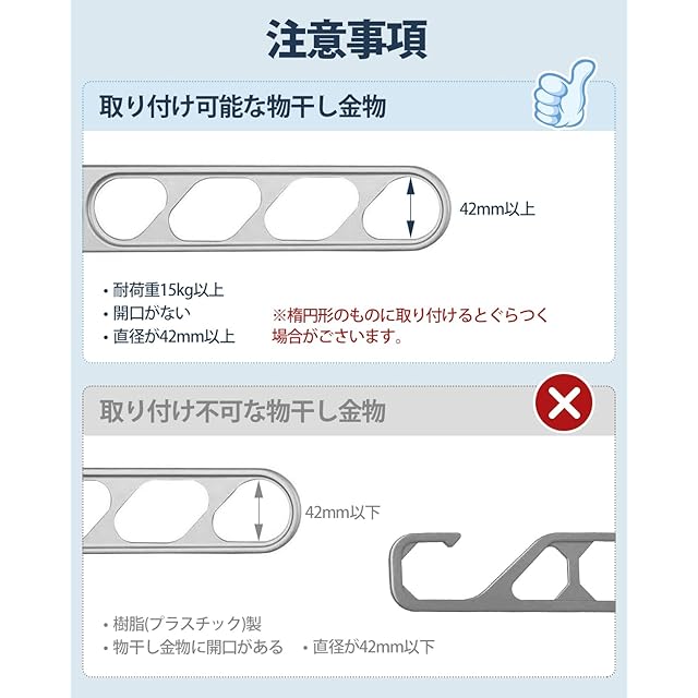 1.【ご購入前の必ずご確認ください】穴の直径が42㎜未満の物干し金物、幅が20mm以上の物干し金物、樹脂製の物干し金物には取付不可となります。※ご購入前に自宅の物干し金物を確認いただき、取付可能な自宅環境か必ずご確認ください。また取付の際に両方の固定具が奥になるように設置してください。正しい向きに設置されていない場合、物干し竿の高さに違い生じます。