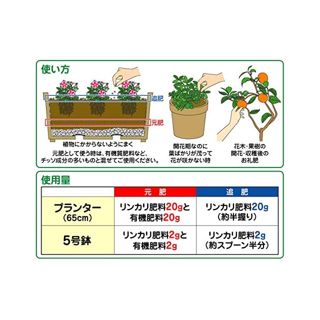 成分:チッソ(N)0: リンサン(P)20: カリ(K)10+ミネラル(マグネシウム、石灰、ケイ酸、鉄、マンガン、ホウ素)