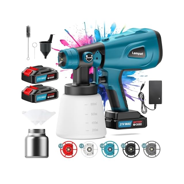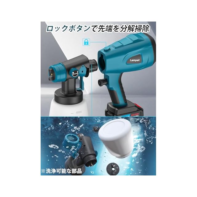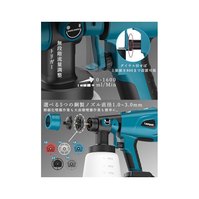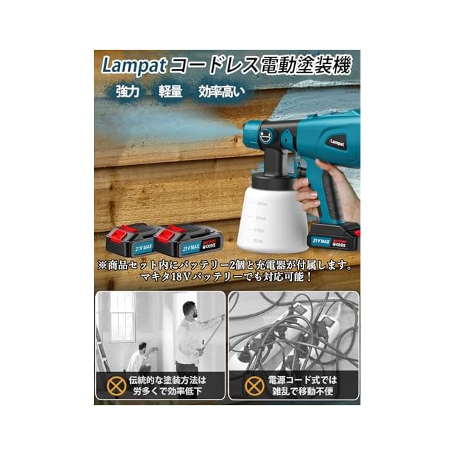 Lampat コードレススプレーガン 【バッテリー二個付属】電動スプレーガン 電動塗装機 2×800ml大容量タンク 5つの銅ノズル 噴射量調節可能 噴霧幅と角度調整 油性水性塗料用 充電式 小型 家庭用塗装ガン ペイントスプレー ペインター DIY吹付 木材 プラスチック 金属 どんな素材にも塗装OK マキタ18Vバッテリー対応可能 日本語取扱説明書 | つむぎ屋