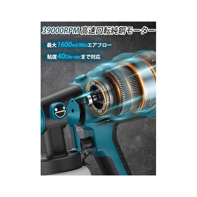 【高品質ブラシモーター】この電動スプレーガンには強力で高効率のブラシモーターが搭載され、回転スピードは39000Rpm/Minでエアフローは160L/Minまで達しており、驚異的な速さで作業できますので、ブラシやローラーでの塗装より半分以上の時間と労力を節約します。コードレスタイプのスプレーガンなので、電線の制限がなく室内でも屋外でも簡単にペイントができ、マキタ18Vリチウムバッテリー対応可能、例えばBL1830 BL1840 BL1850 BL1860 BL1860B BL1830B BL1850B BL1860B BL1890Bなどが適用します。【商品セット内に電池は含みません。】