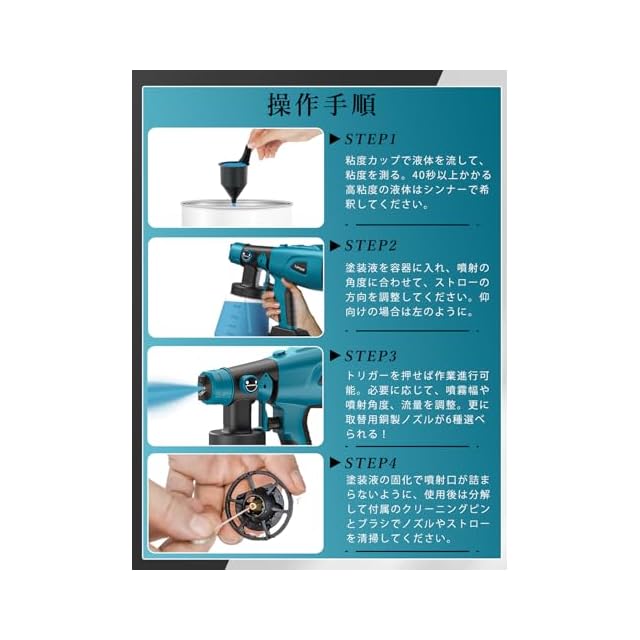 【付属品及び品質】この商品セット内の付属品:コードレススプレーガン本体*1、800ml塗料タンク*2、銅製ノズル*5(1.0mm-3.0mm)、漏斗*1、ろ紙*2、クリーニングブラシ*1、クリーニングピン*1、日本語説明書。(バッテリーと充電器は別途ご購入ください。)出荷前に厳格な品質検査が行われておりますが、万が一、お手元に届いた商品に欠陥があるか、使用中に疑問がある場合は、「注文履歴」➡「出品者に連絡する」から弊社ショップにご連絡ください。担当者は24時間以内に返信し、真摯にご対応させて頂きます。