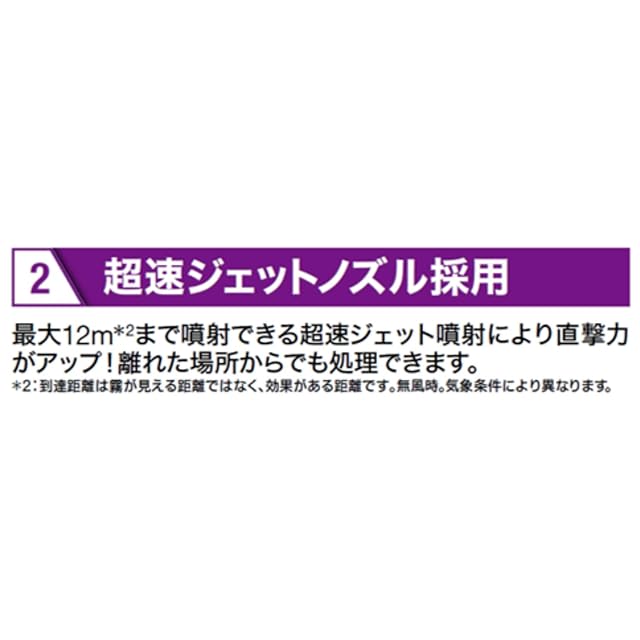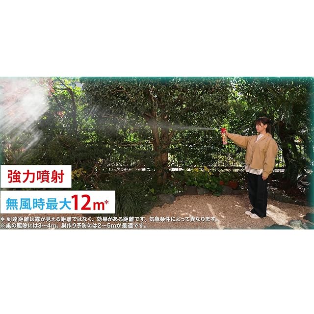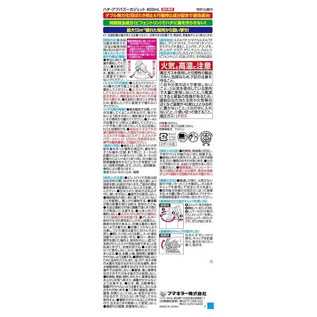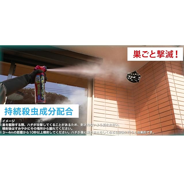 適用害虫 :スズメバチ(ツマアカスズメバチ含む)、アシナガバチ、クマバチ(タイワンタケクマバチ含む)、ミツバチ、アブ、クモ、ガ、ムカデ、ヤスデ、ゲジ、ケムシ、カメムシ