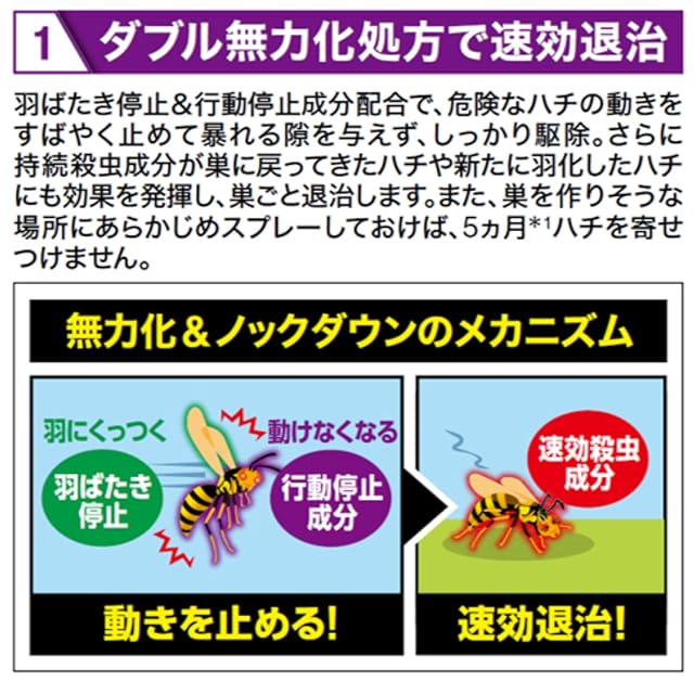 羽ばたき防止&行動停止成分配合でハチを退治します。