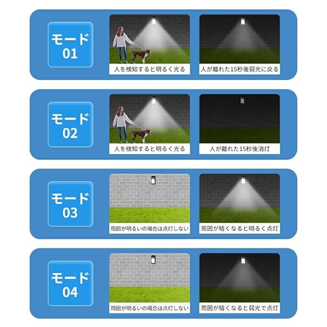【スマートな人感センサー&4つ点灯モード】ボタン1回押して、72LEDセンサーライトは常夜灯+人感モードの4つモードが切り替えます。人感センサーで、暗くなる時人が通ると強力に自動発光します。