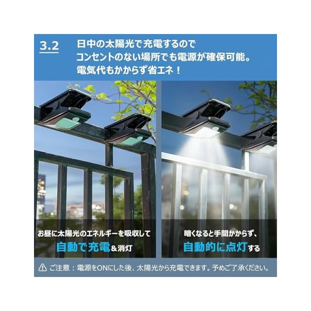 【3000mAh大容量バッテリー】クリッパ センサーライトは3000mAhの充電可能のバッテリーと多結晶のソーラーパネルを搭載しているので、フル充電の場合は6-8時間使用可能です。照明範囲:40-50平米、光源:72個LEDビーズ。