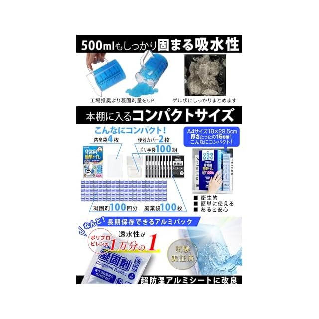 【長期保管できるアルミパッケージ採用】水を吸って固まる凝固剤は保管時に吸湿すると固まってしまいます。気密性の高い”超防湿アルミパッケージ”を採用。透明なパッケージは、日光が当たると劣化して破けてしまいますが、アルミは光を通さず、酸素の透過率も低く長期保管に安心です。凝固剤は成人1回あたりの排尿量 約200ml~400ml を水分をしっかり固めるため、すぐにゴミとして処理することが可能です。いざというときに安心してお使いいただけます。