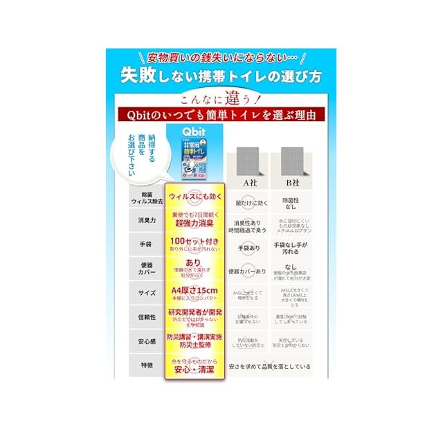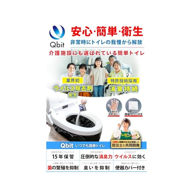 【業界初!ウイルスに効く除菌剤入り】Qbit簡単トイレは高い除菌効果があり、大腸菌などの菌類のみならず、携帯トイレ業界にはなかった、ウイルスに有効な除菌剤を入れています。災害用だけでなく、介護分野のお客様のご要望により凝固剤を開発しました。
