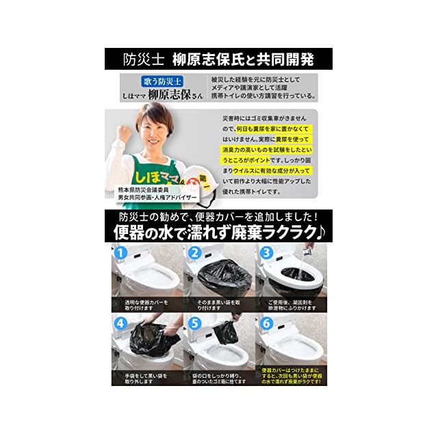【防災士と共同開発 非常用トイレ 50個分のセット内容】 黒色ポリエチレンビニール袋 50枚 1枚ずつ取り出すことができます。ポリエチレンビニール手袋50組、凝固剤50個、便器カバー用透明袋2枚、防臭袋2枚、お試しセット(本体の箱に入っています)