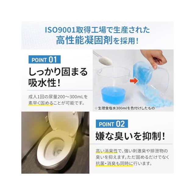 【凝固剤の量を増量】一般的な凝固剤は1袋あたり7g程度のものが多いですが、7gでは足りないというお声をうかがい、10gに増量しました。一般成人の1回の尿量200~400mLを固めることができます。