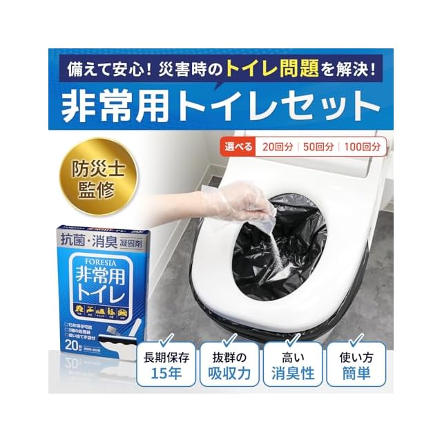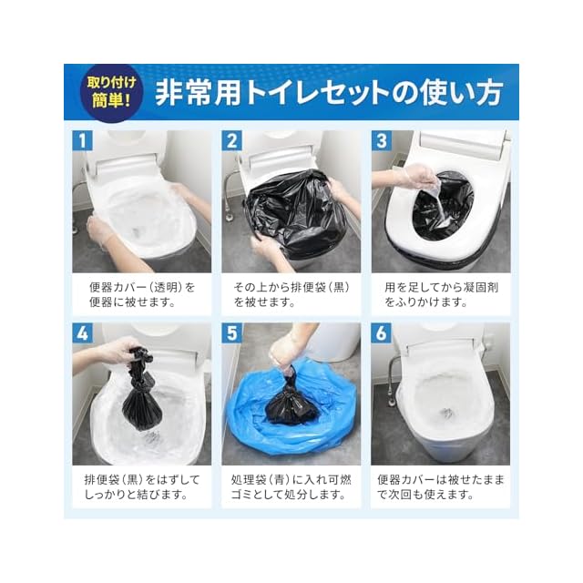 【セット内容】凝固剤50包、排便袋(黒)50枚、便器カバー(透明)5枚、保管袋(青)5枚、使い捨て手袋50組。