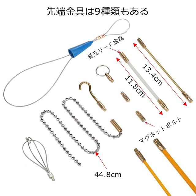 【機能アップできる9種類の先端金具】先端金具は9種類もあります。 ロッドの進行方向の障害物を乗り越えることができます。配線リード金具、ボールチェーン、フック、リン、マグネットボルト、穴付き配線リード金具、蛍光リード金具、結線金具、先端誘導金具。