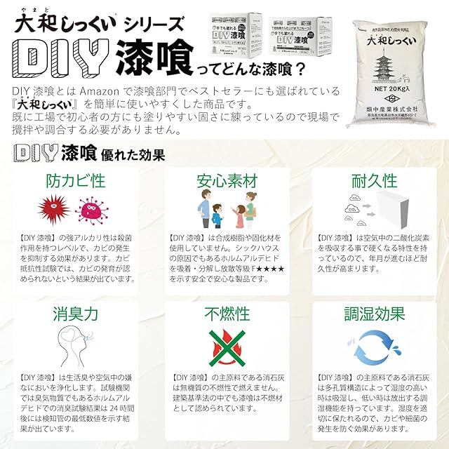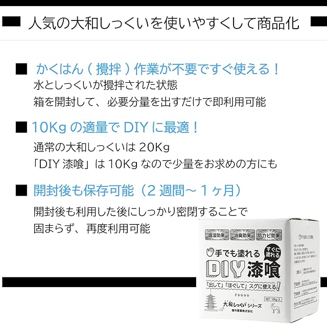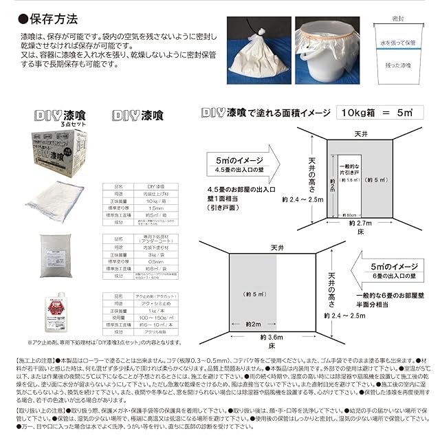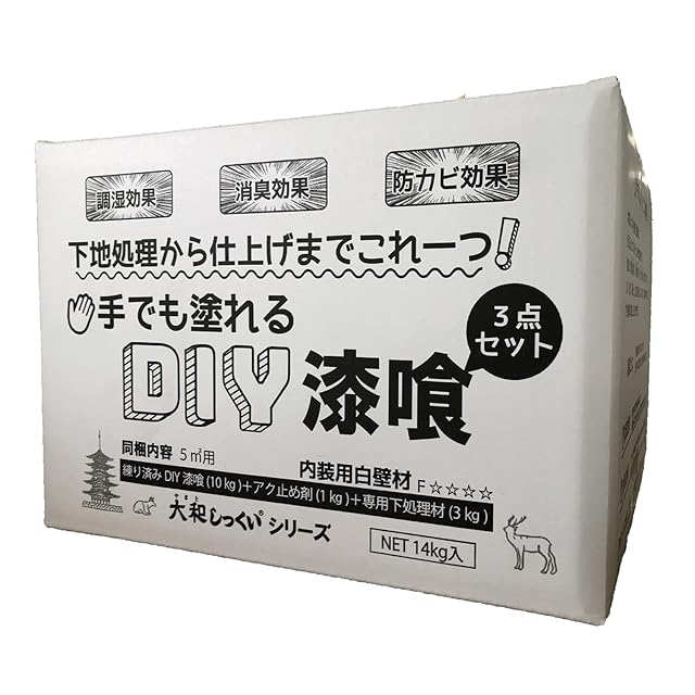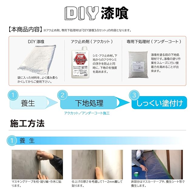 内容量:DIY漆喰 10kg・専用下処理材(アンダーコート) 3kg・アク止め剤(アクカット) 1kg