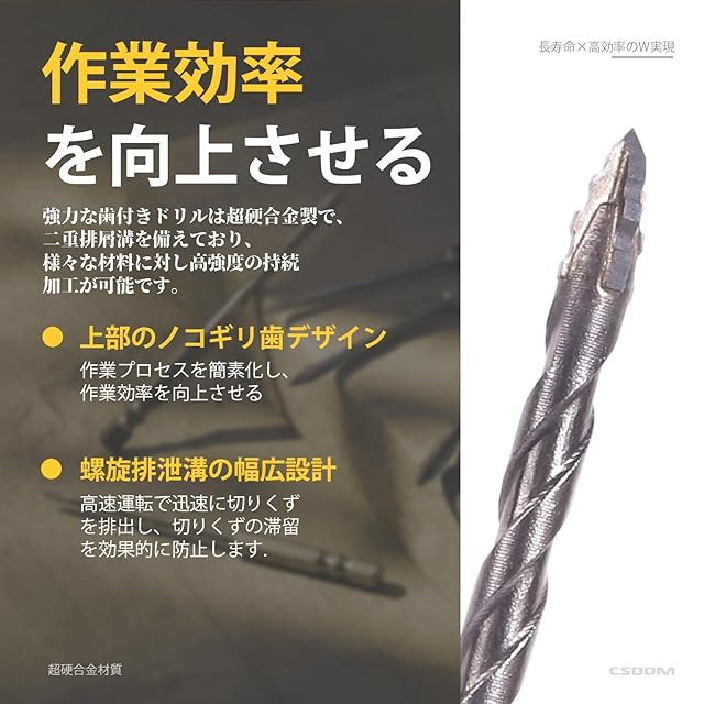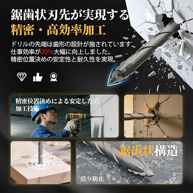 【超硬合金チップで最適切削】 タングステンカーバイド(硬質合金)チップ採用。コンクリート・花崗岩・硬化磁器タイルなどに高耐久。ガラス繊維入り建材や薄板金属にも最適。