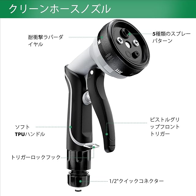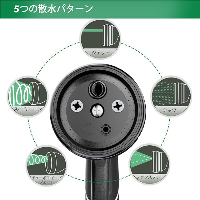【5つの散水パターン】スプレーヘッドのダイヤルを回して、ジェット、シャワ一、旋回コーン、ファンスプレ一 タ一ボスイ一ピングジェット、垂直から散水パターンを選択できます。中庭の掃除には高圧ジェット、洗車には便利なアングル、愛犬の洗車には優しいシャワー、庭の花の水やりにはソフトなミストなど、5つのパターンですべてカバーできます。