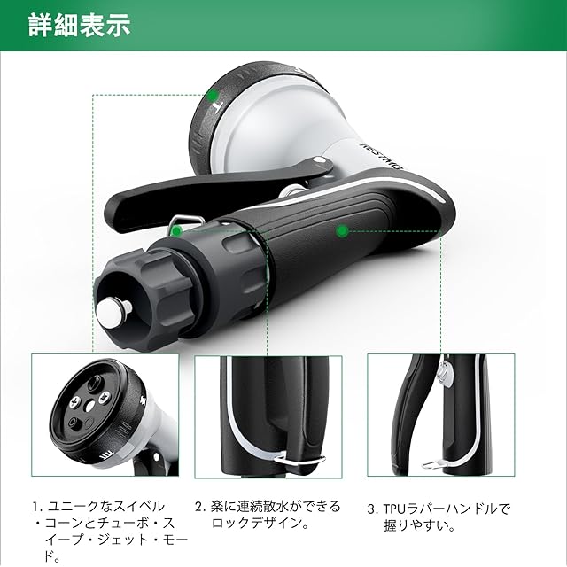 【人間工学に基づいたデザイン】ユニークな形状のハンドルで、このホースノズルは複数のサイズの手に対応します。柔らかいTPUゴムで80%コーティングされ、滑りにくいグリップです。細くて繊細な手でも、丈夫で力強い手でも、水やりの時に手の疲れを忘れ、いつも快適に感じることができます。