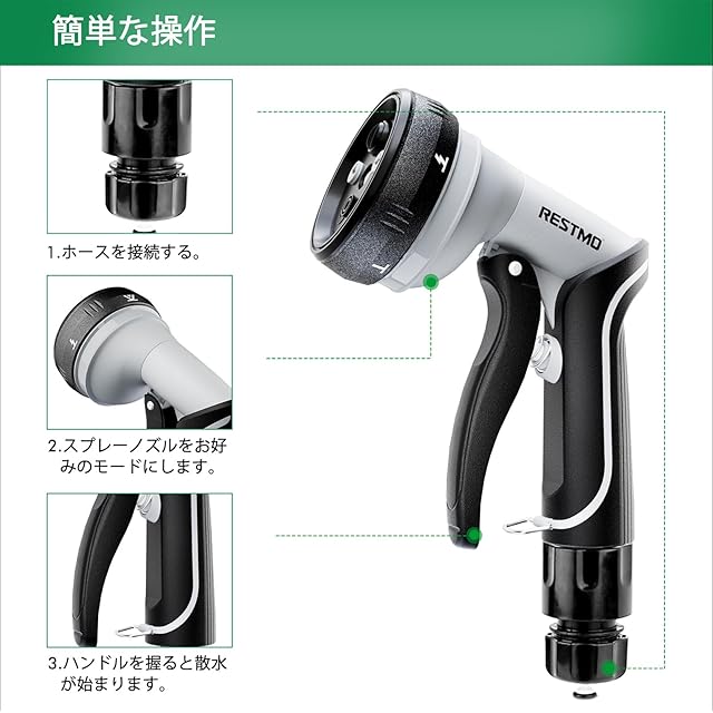 RESTMO ホースノズル 散水ノズル プラスチック ロック可能なフロントトリガー 頑丈 洗車 旋回コーン 多様なスプレーパターン付き 清掃や洗浄に最適