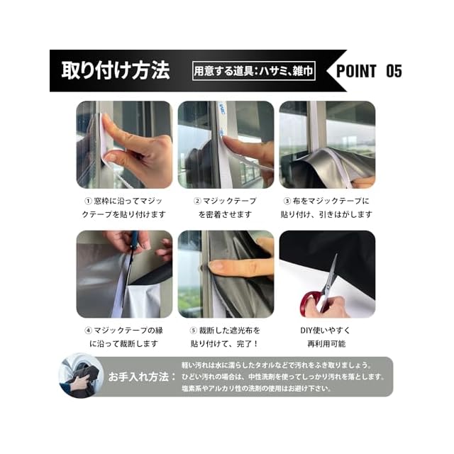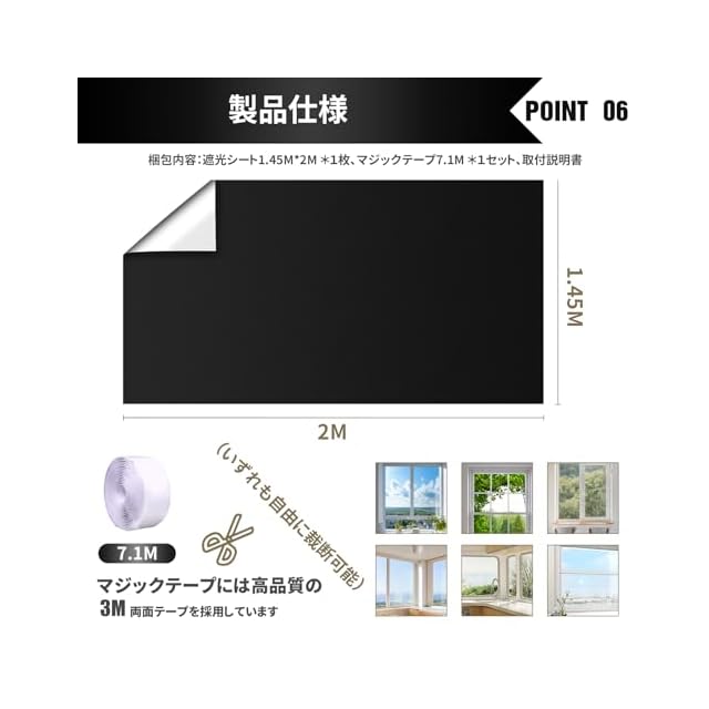 【様々なシーンで大活躍】防水効果もあるため、自宅の窓やバスルームのドアなど、テープが貼り付けられるところであればお好きにご使用していただけます。フリーカット可能だから、どんなサイズにも合わせやすいです。製品サイズは1.45*1 M、5.1 Mマジックシール付き。