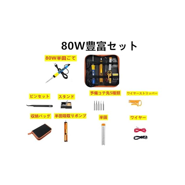 【セット内容】はんだごて*1、こて先*5、ごて台*1、スポンジ*1、はんだワイヤー*1、はんだすいとり器*1、収納バッグ、ピンセット*1、赤ワイヤー*1、黒ワイヤー*1ワイヤーストリッパー*1