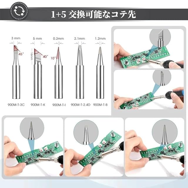 【セット内容】はんだごて*1、こて先*5、ごて台*1、スポンジ*1、はんだワイヤー*1、はんだすいとり器*1、収納バッグ、ピンセット*1、赤ワイヤー*1、黒ワイヤー*1